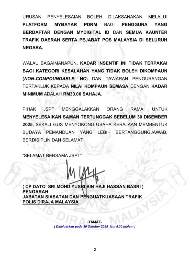 DISKAUN SAMAN PDRM 70% MULAI 1 NOVEMBER 2025